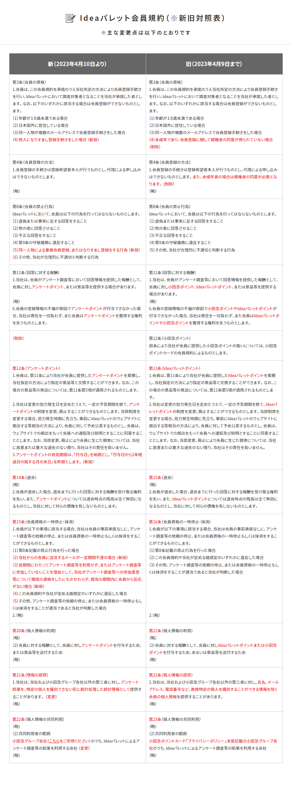 会員規約の変更について:新旧対照表